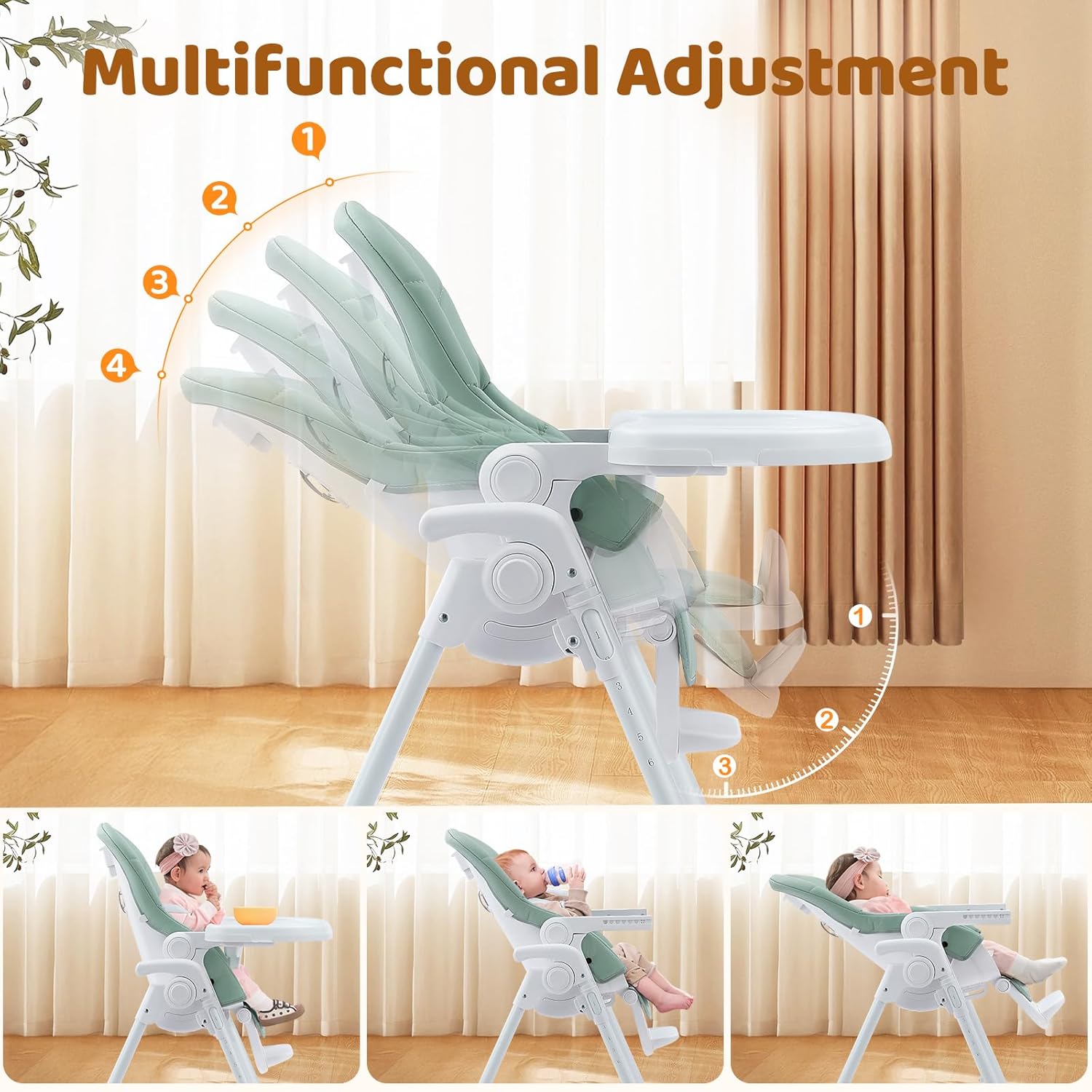 Ezebaby Foldable High Chairs for Babies and Toddlers, Portable Baby High Chair with Multiple Adjustable Seat Height, Backrest, Footrest, Detachable PUCushion&Tray, 2Back Wheels, Green