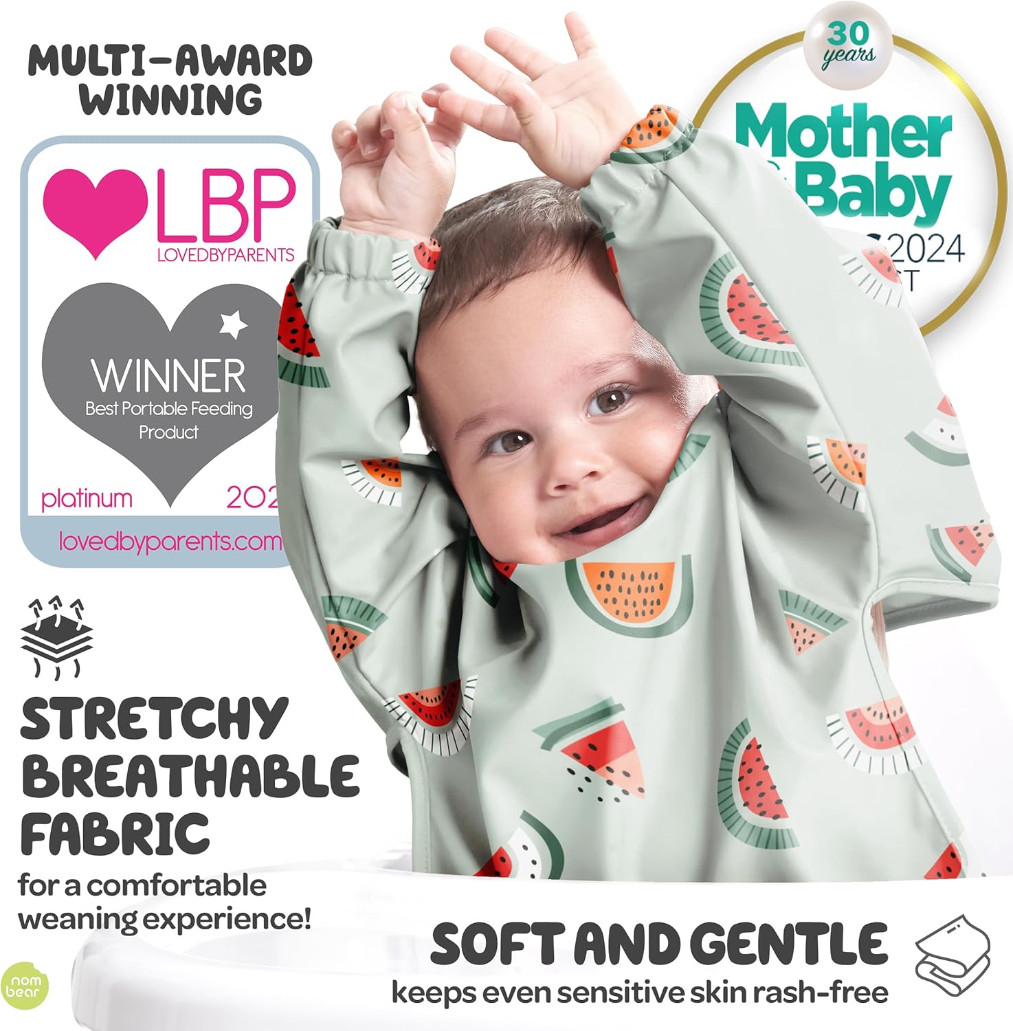 Is your little one ready for solids? Then it’s Yummy Time! Help your baby enjoy the discovery of food while getting messy to their heart’s content with our beautiful long sleeve baby bibs for eating. Lightning quick button fastening for when dinner’s ready. No fiddling with tie-ups or hook and loop fasteners. And with elasticated cuffs, our smock bibs for babies is gentle on those chubby wrists. Skip the tears about soggy wet tops and awkward clothing changes halfway through the meal. It won’t be the end of the world if they end up wearing their food, which let’s be honest can happen in those early stages. These 100% polyester waterproof baby bibs are easy to wipe clean, or wash in a hurry to get out the smushed blueberries and avocados. Ready for action when you need it, let your baby or toddler explore and discover without worrying about cleaning up the food apocalypse afterwards. Suitable for early weaners and as your baby grows, our toddler bibs with sleeves are not only great for snack and mealtimes, but other messy fun like painting and wet play. There are no garish colors here, just a beautiful baby feeding bib in a soft touch fabric which is both waterproof and breathable. Ideal for baby led weaning (BLW), and more than cute. At Nombear we want to help your little one discover a love of food. It’s our company mission. That and full tummies everywhere.