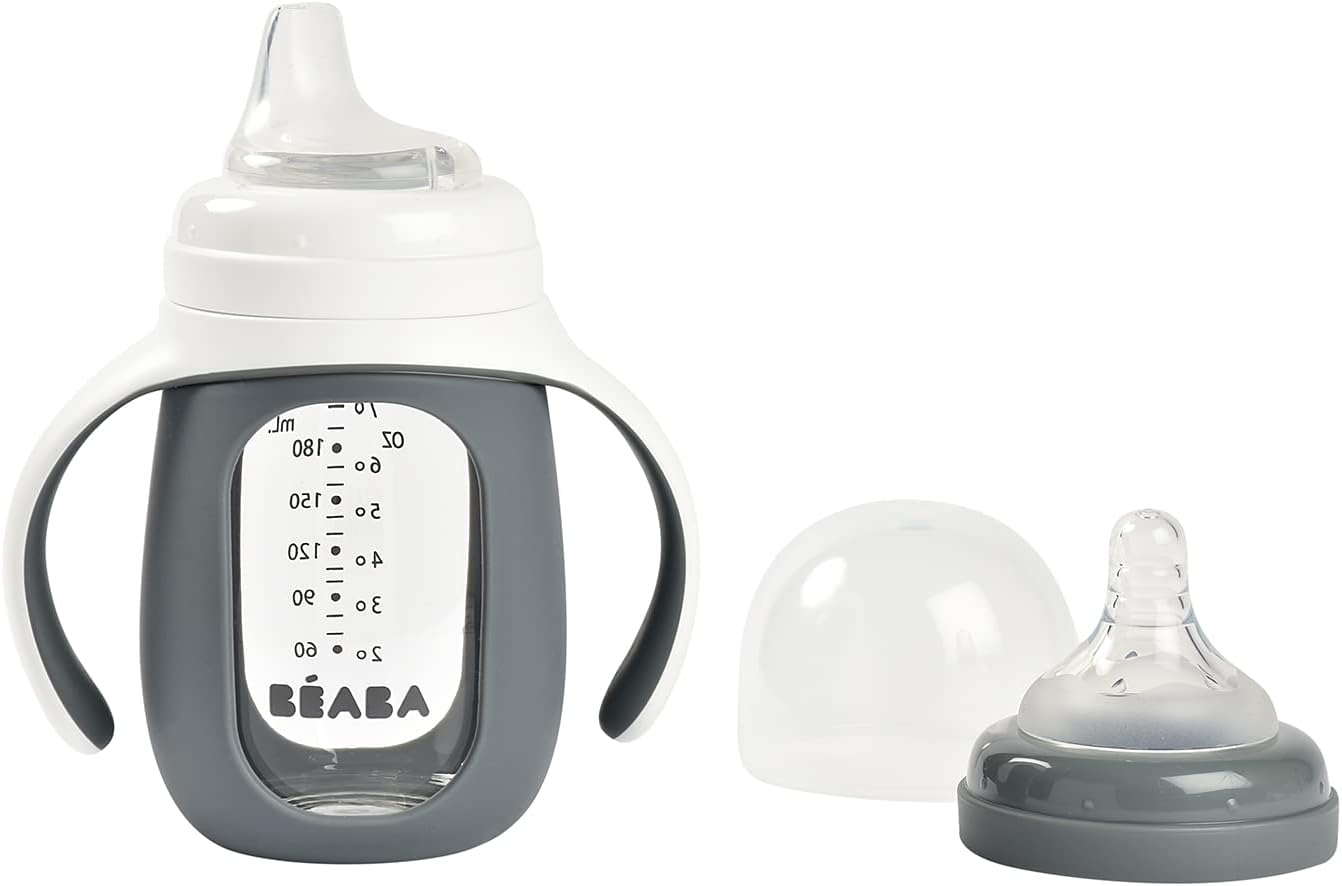 The BEABA 2 in 1 glass baby bottle to learning sippy cup is designed to help babies 4 months and older transition from bottle-feeding to drinking on their own. Thoughtful design supports this developmental milestone by combining elements of both bottle and sippy cup.