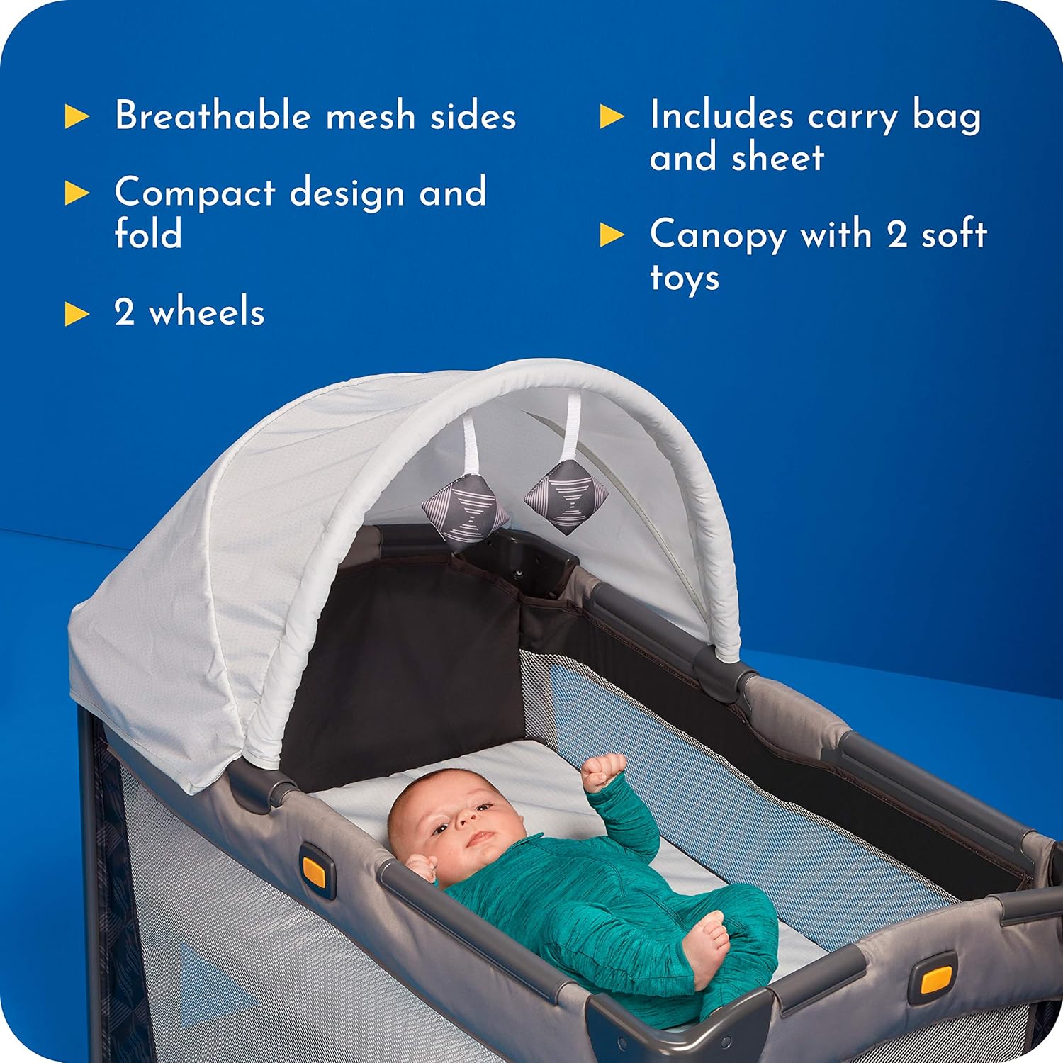 Over the river and through the woods…no matter where you go with your little, the Century® Travel On™ LX 2-in-1 Compact Playard with Bassinet gives them a space all their own. With a small footprint and compact fold, it’s bound to be a favorite travel companion. A cozy sheet is included (hello, savings!) with this 2-in-1 space savior that transforms from an infant bassinet to a toddler playard. But the thing we’re most proud of? As part of our Happy Planet Collection, this playard is crafted with fabrics made with recycled materials—part of our Do More™ promise to Recycle, Reimagine, and Give Back. Oh! And why do we call it LX? Think of it as the “Little X-tras” we added, like a large canopy for dreamy naps and soft stars for baby to stare at adoringly.