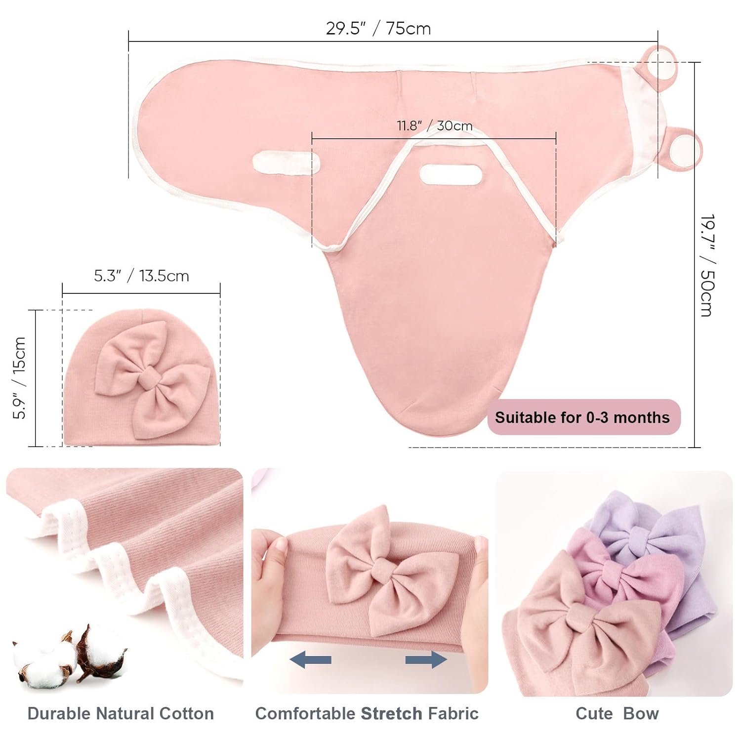 DRESHOW BQUBO 3 Pack Baby Swaddle Sleep Sacks Baby Swaddle Blanket Wrap Newborn Swaddle Sack with Big Bow Hat for Baby Boys Girls 6-12 Lbs Newborns & 0-3 Months Girls Boys