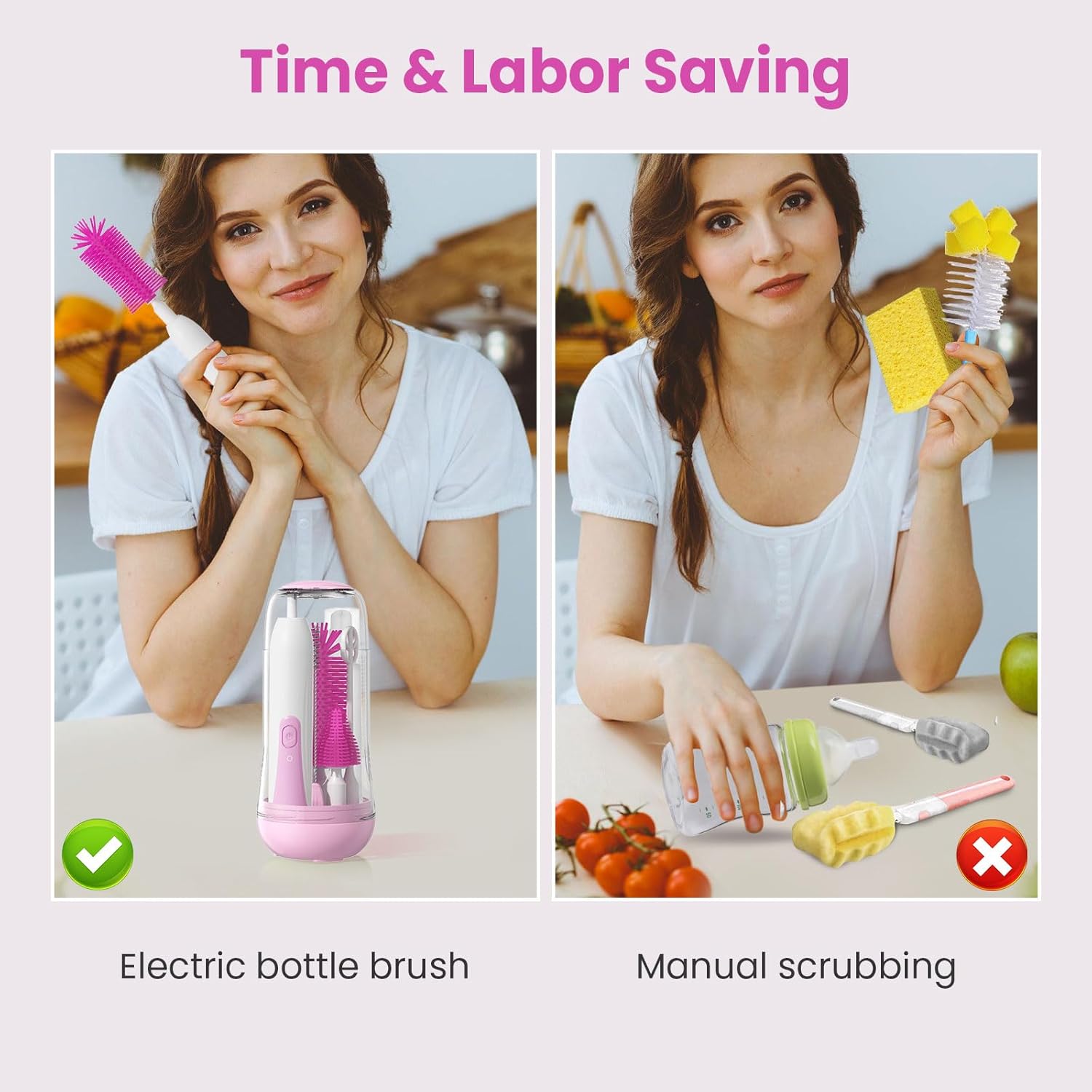 【Perfect for After Birth Mom】: Make life easier for new moms with our electric cleaning brush set. This travel bottle cleaner kit not only saves time and energy but also alleviates physical burdens and sore wrists caused by daily bottle cleaning. The perfect for new parents.