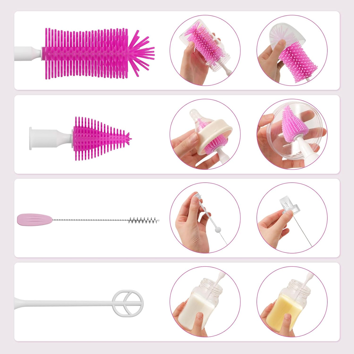 Electric Bottle Brush Cleaner, Baby Bottle Cleaning Kit with Nipple Straw Brushes Drying Rack ​​Soap Dispenser Rechargable Waterproof Multi-Purpose E-Brush Set for Travel & Home, Pink Purple