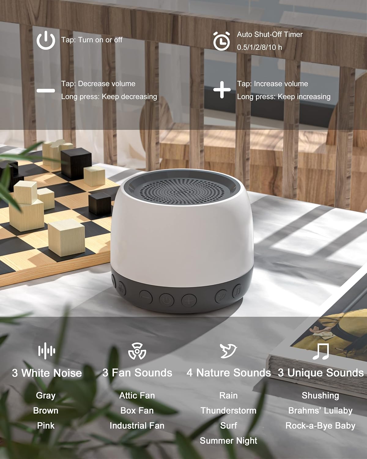 [Memory function, user-friendly] The sleep noise machine has continuous play and automatic shut-off options for intervals of 0.5, 1, 2, 8, and 10 hours, as well as a memory for frequent settings for sound level and timer, so you can easily set up the device by pressing a few buttons rather than repeating all the steps every time.