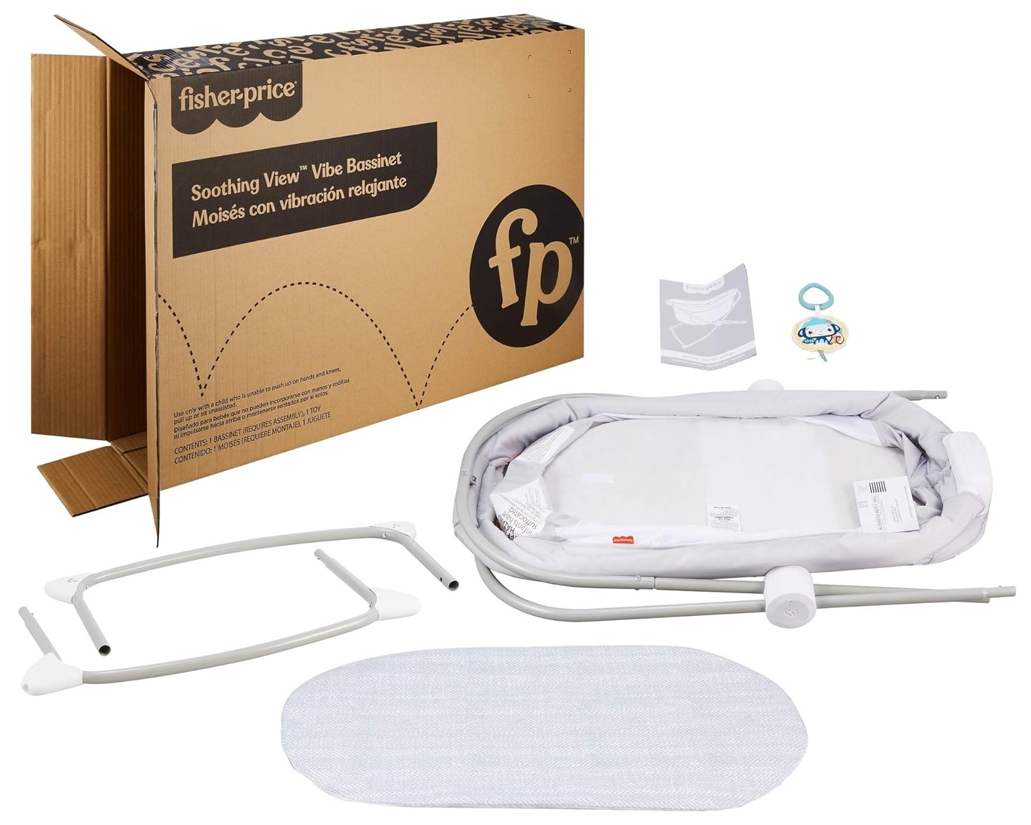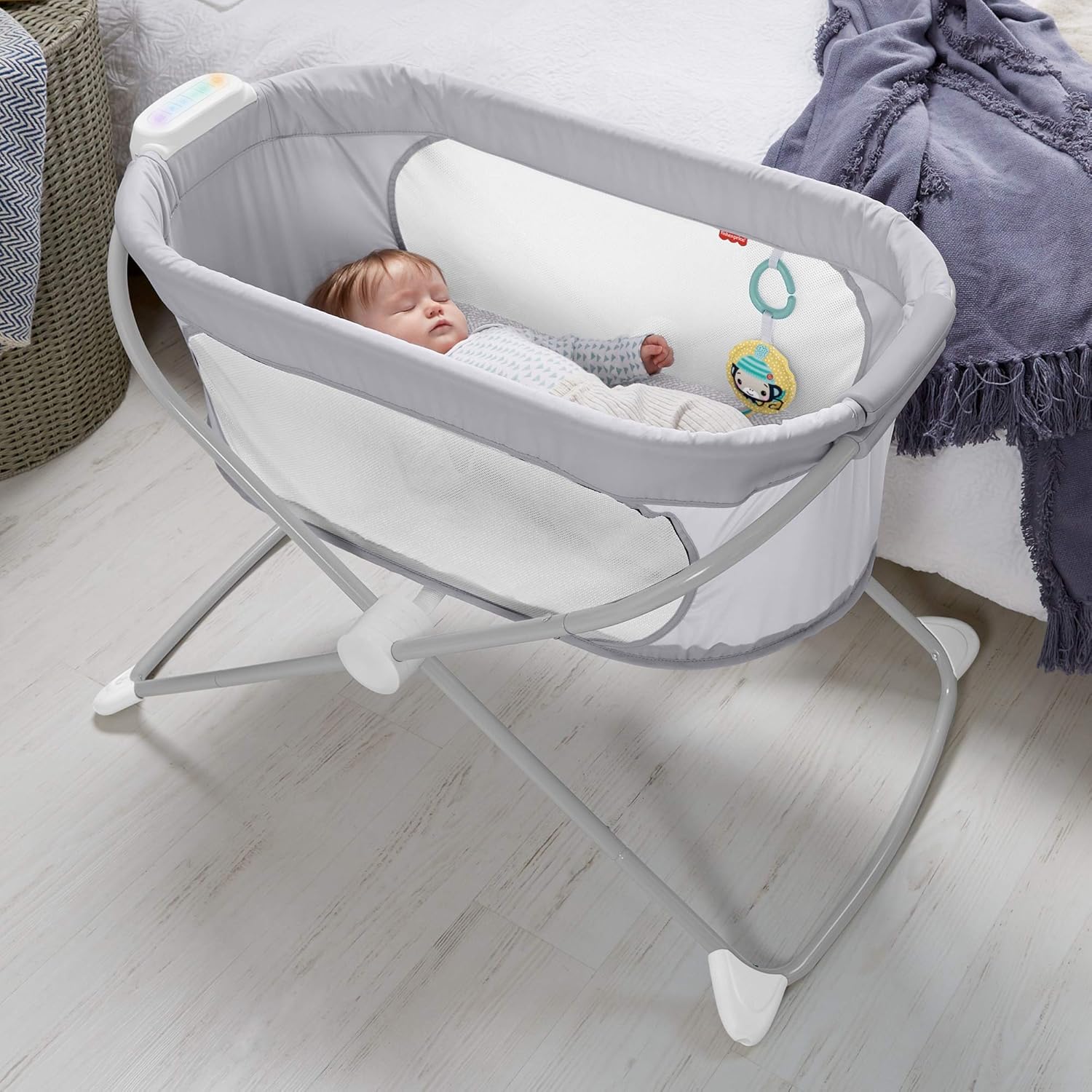Calming music and white noise help soothe baby, plus soft toy that links to bassinet for play