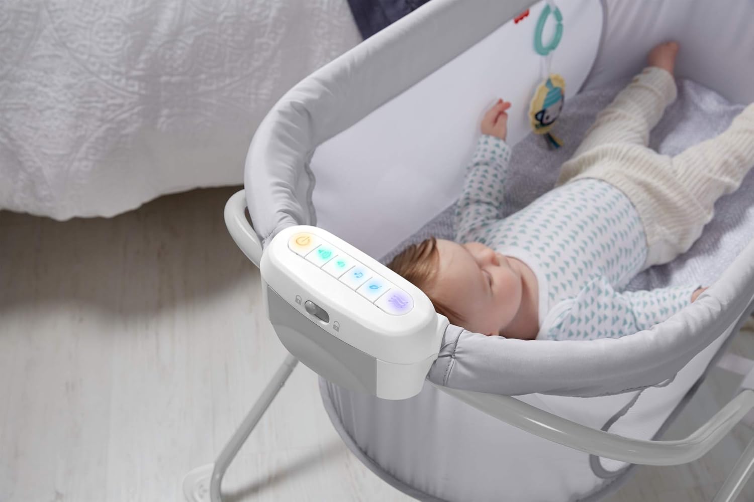 Calming music and white noise help soothe baby, plus soft toy that links to bassinet for play