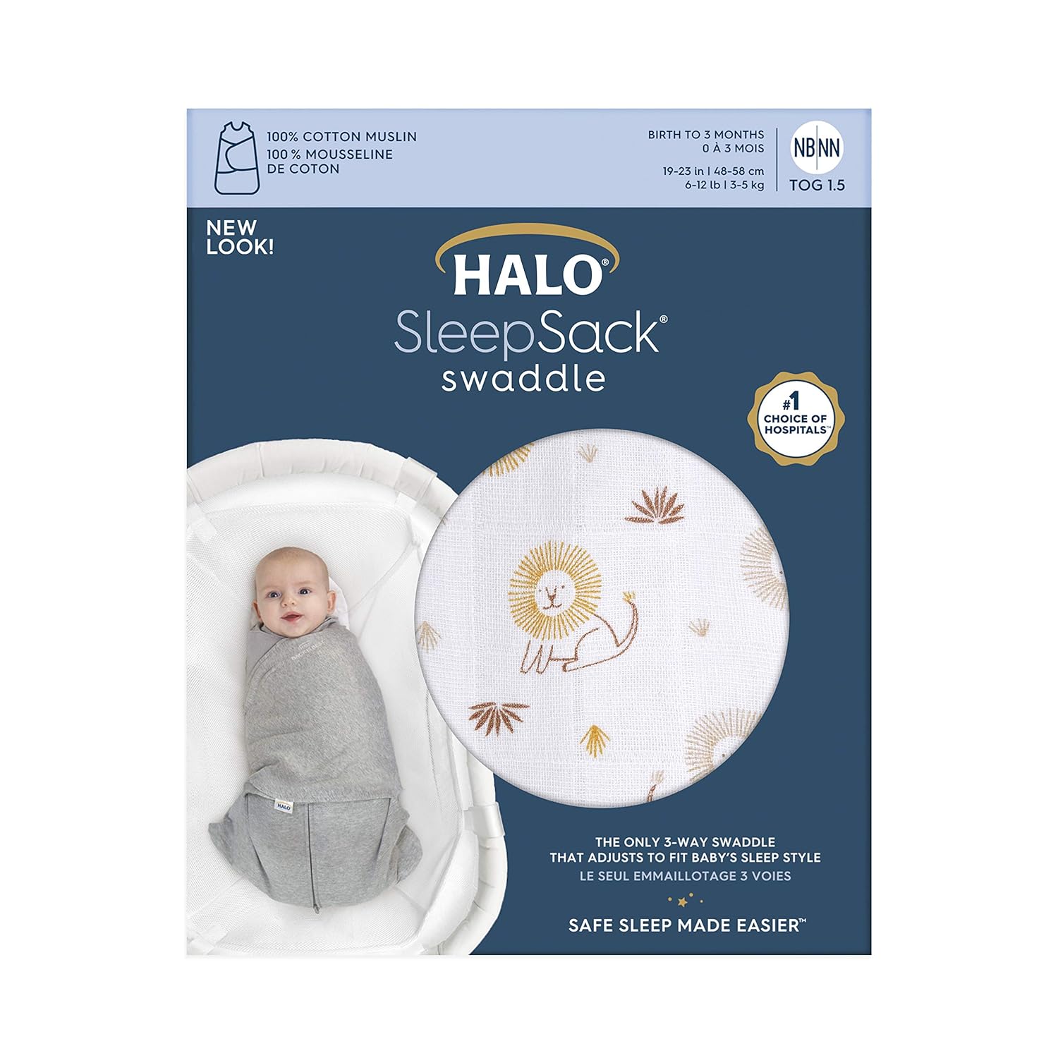 HALO 100% Cotton Muslin Sleepsack Swaddle, 3-Way Adjustable Wearable Blanket, TOG 1.5, Lions, Newborn, 0-3 Months