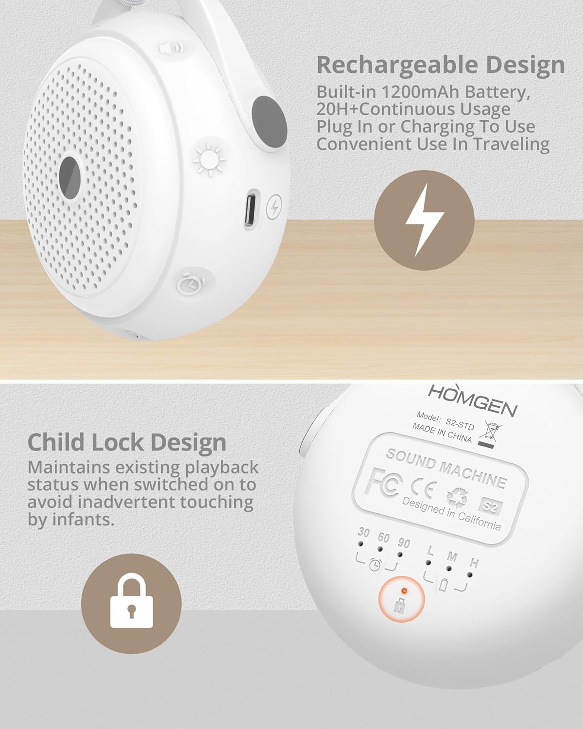 *𝐑𝐞𝐜𝐡𝐚𝐫𝐠𝐞𝐚𝐛𝐥𝐞 𝐃𝐞𝐬𝐢𝐠𝐧 &𝟐𝟎+ 𝐇𝐨𝐮𝐫𝐬 𝐁𝐚𝐭𝐭𝐞𝐫𝐲 𝐋𝐢𝐟𝐞*—-:Our HOMGEN White Noise Machine for Baby Built-in Large Capacity Battery (1200mAh), can Last about 20h.And No Longer have to Worry about Finding a Power Source and Worry, you can Use Our White Noise Sound Machine Anytime and Anywhere to Enjoy the Freedom of Sleeping.