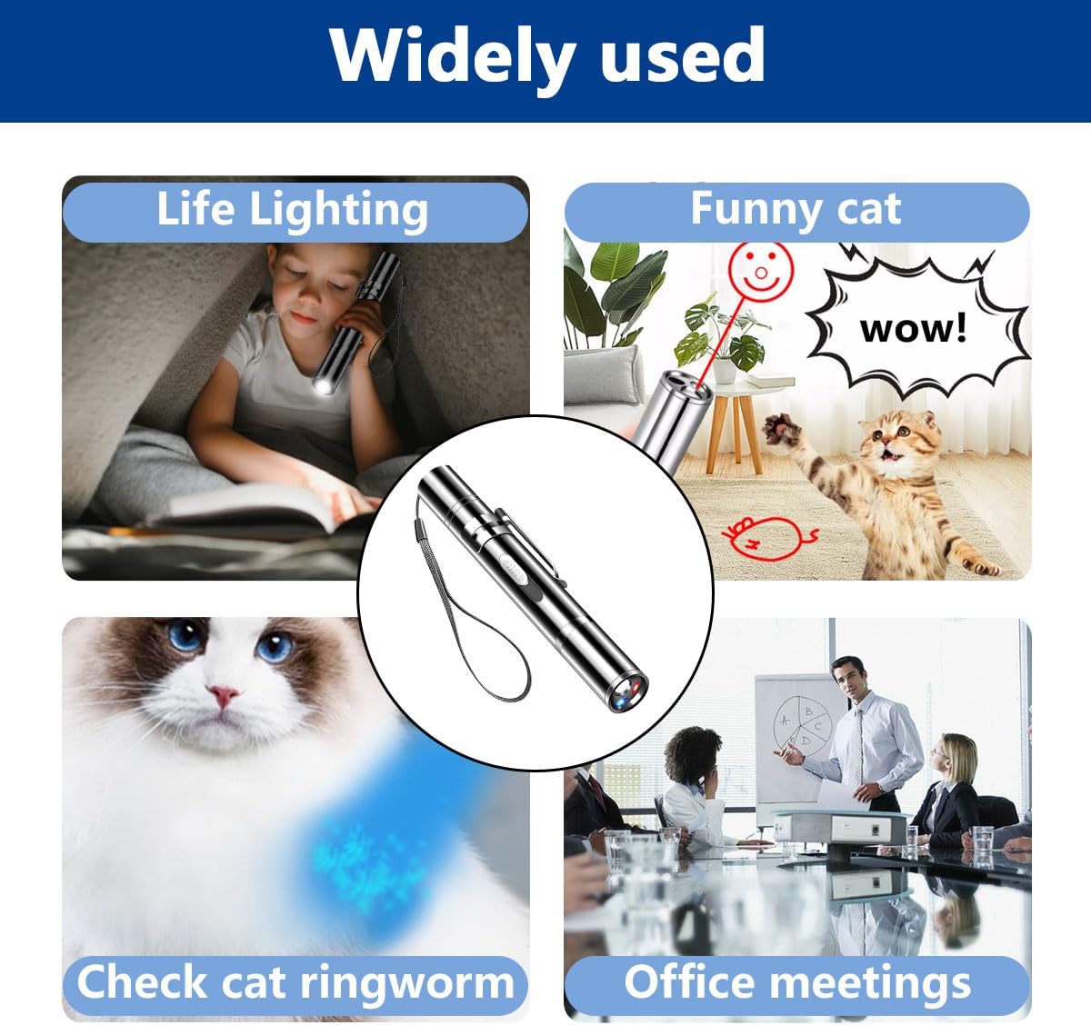 【Triple Light Modes】Our cat laser toy combines red, white, and purple lights to cater to various needs. The red light ignites your pet’s chasing instinct, adding a burst of energy; the white light is perfect for nighttime illumination or emergencies.