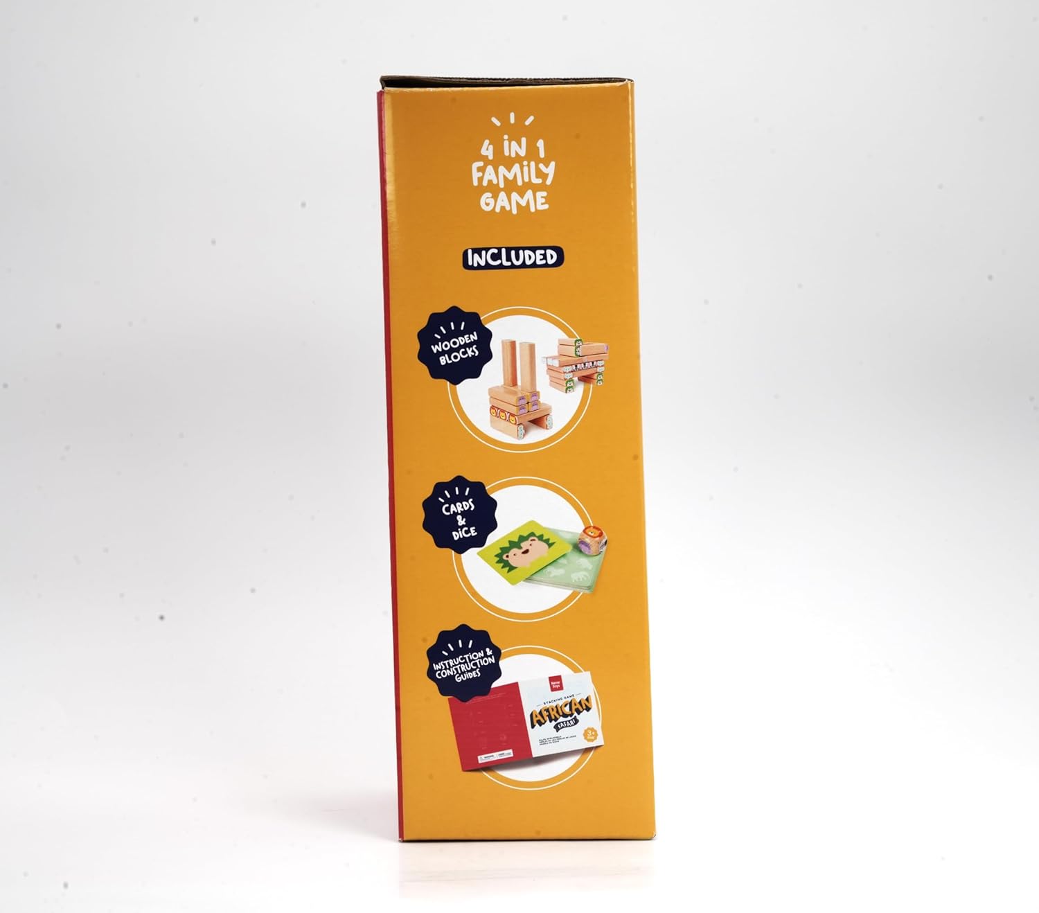 Nene Toys Wooden Block Stacking Game – 4-in-1 Tumble Tower Family Board Game with Building Blocks, Cards and Dice – African Safari Educational Wooden Toy for Kids 3-9 Years Old About Animals