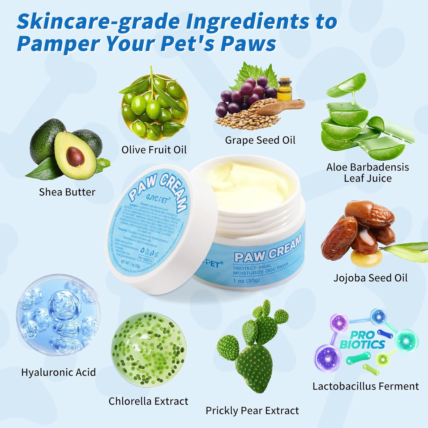 This GJYC PET Nourishing Pet Paw Cream does what it promises!It has a wonderful selection of natural ingredients, and is delivered in a light cream/lotion-type formulation (feels like my own face lotion). It is easy to apply to my pups’ paws, and I like to do that after they’ve been outside especially in cold weather and if the sidewalks have salt on them) — I’ll wipe their paws and then, while still a bit damp, massage in this Paw Cream and it does make their paw pads and toe beans soft and happy!A funny note about this cream, though–my girl dog likes it a little bit TOO much…we have to distract her or she’ll lick it all off! LOL (Which is part of why it’s great this cream has good ingredients.)It does NOT leave any mess or grease on the floor or anything–very impressed by that.Two paws up!