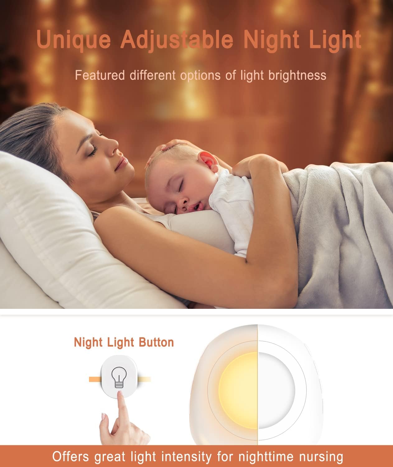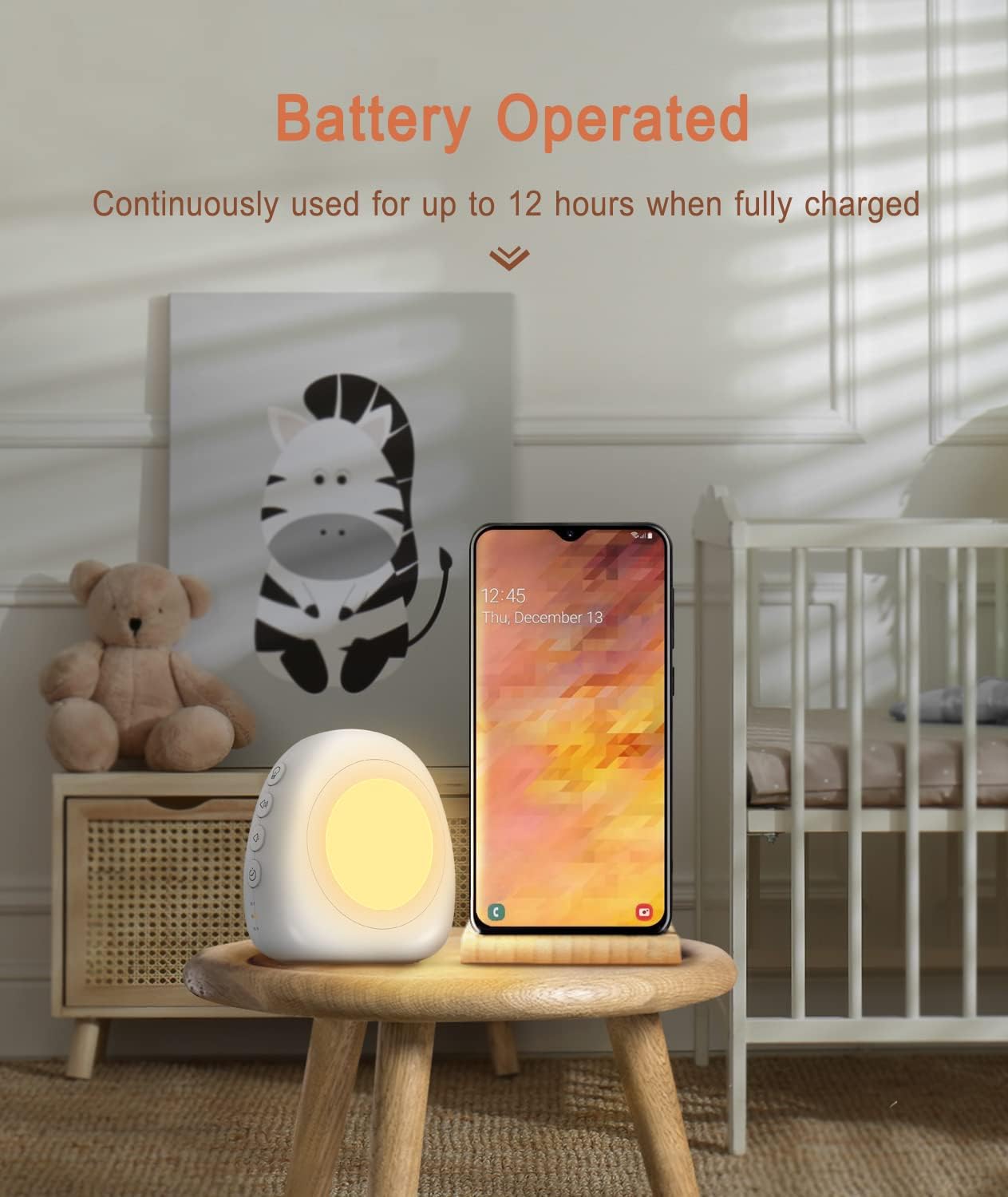 Sound Machine Baby and Night Light: This baby sound machine features an optional night light which emits enough brightness for baby night feeding. It has been proven that babies fall asleep easily with warm lights and lullabies. Noise machine can operate 12+ hours on a single charge, and comes with convenient USB cable for recharging.