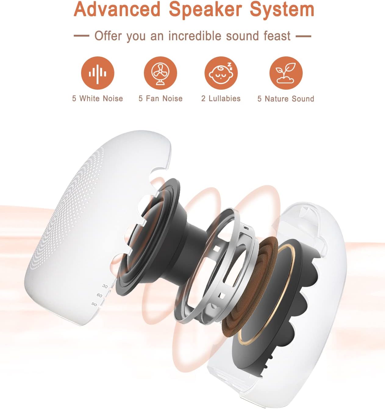 Advanced Speaker System: This solid sound machine creates relaxing and sleep atmosphere by offering exquisite listening experience. Easy sleep white noise machine has 2 lullabies, 5 white noise, 5 fan sounds, 5 relaxing natural sounds (Shush, Fetal Sound, Bird, Ocean Wave, Thunderstorm)