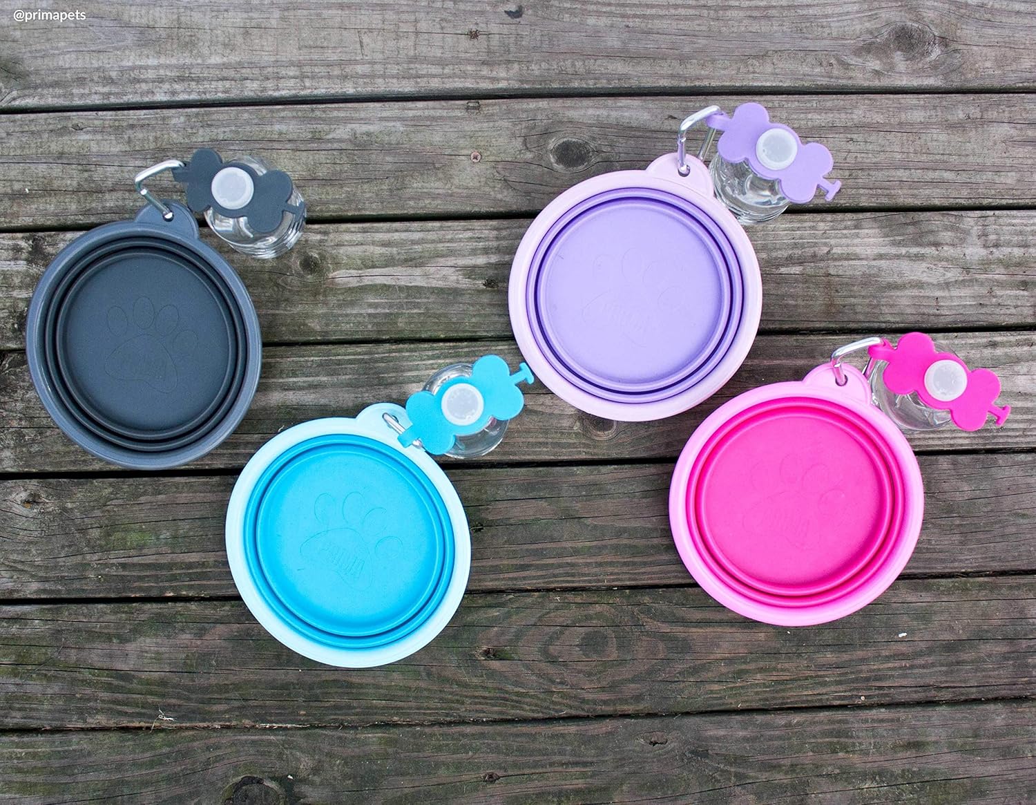 Prima Pets Silicone Travel Bowl is ideal for outdoor and home use. This non-absorbent travel bowl is made of BPA-free material. The bowl provides the ideal solution for pet parents on the go. This portable pet bowl is collapsible and folds down to less than 1/2 inch for easy storage or transport and pops back up for use. Each bowl can hold a capacity of 1.5 cups. Perfect for travel, parks and walks Collapsible to less than 1/2-inch to fit in most pockets Made of durable non-porous food grade silicone and sturdy BPA-free plastic rim Top rack dishwasher safe BONUS: Includes Quick Release Carabiner Clip to conveniently latch bowl to your leash. (Please note the carabiner clip is not suitable for climbing) 1.5 cups size measures 5 inch wide x 2.2 inch tall when opened. Sturdy 2.6 inch bowl base prevents bowl from tipping over. Great size for XS to Medium Dogs and All Cats Colors Available: Aqua or Purple Prima Pets is committed to creating quality pet products! CARE INSTRUCTIONS: For proper hygiene, always wash pet products after each use. Dishwasher Safe (Top Rack)