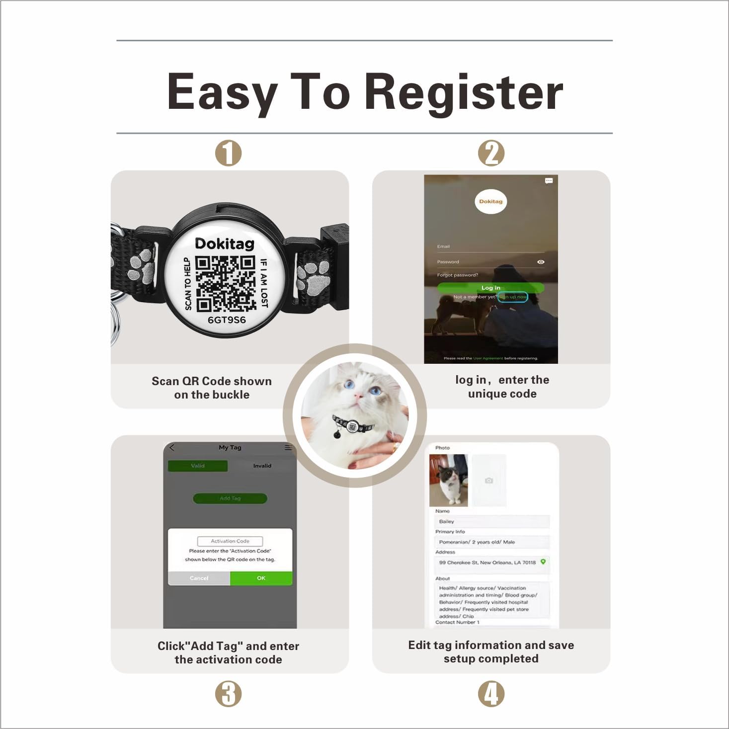 Personalized Cat Collar With Pet ID Tag:Scan the QR code on the collar buckle to activate the tag, create an profile for your pet, you can add multiple emergency contacts, upload multiple pet photos, your home address, pet’s medical information, etc; One account can manage multiple pets;Anyone who finds your pet can access your pet’s profile and contact you to return it home;No need for APP, No Subscription fee