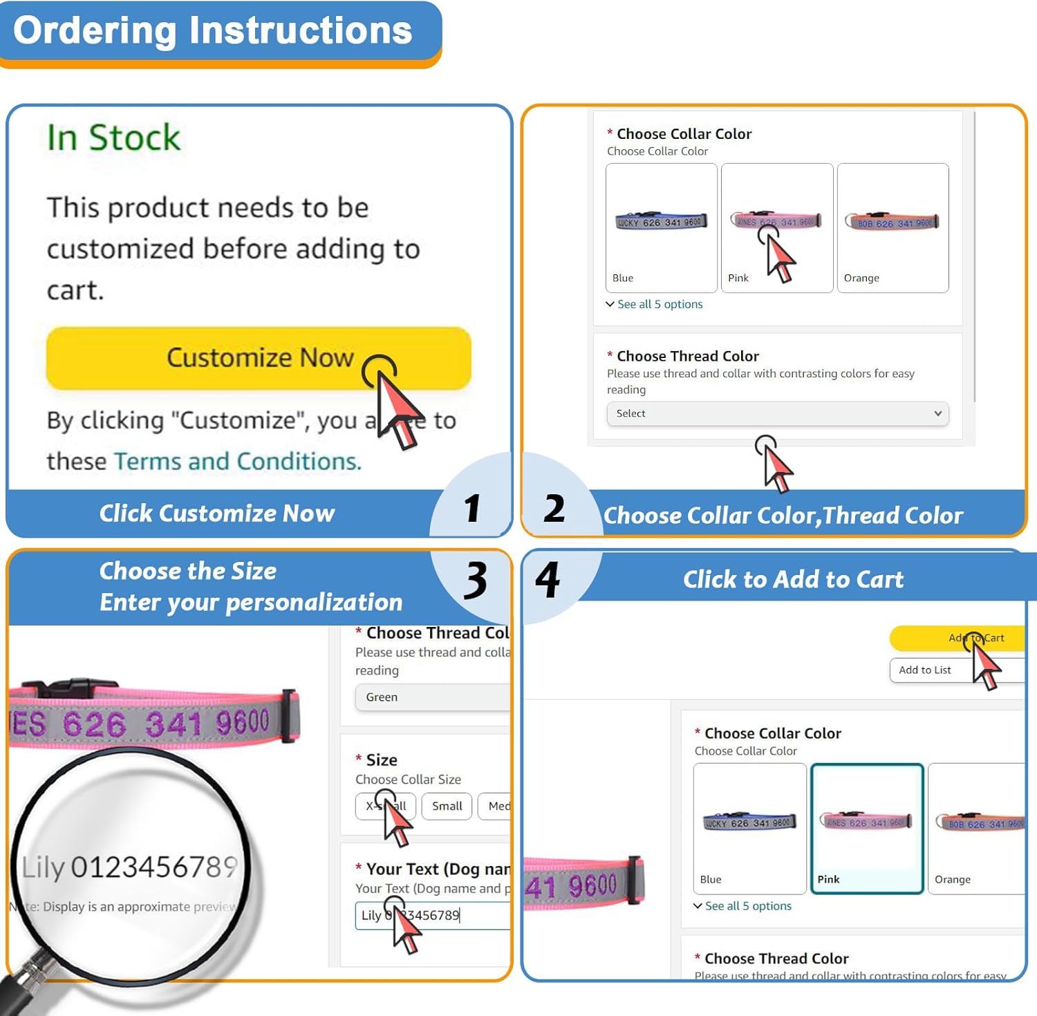 【How to Customize】Please click “Customize Now” and enter: (1) Collar colors: black, orange, red, blue, pink; (2) Collar size: XS, S, M, L, XL; (3) Collar text: Pet name and phone number – up to 25 characters. After completing the customization, click “Add to Cart”.