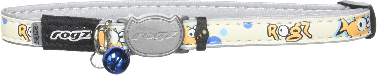 Rogz Glow in the Dark Reflective Cat Collar with Breakaway Clip and Removable Bell, fully adjustable to fit most breeds, Gold Fish Design