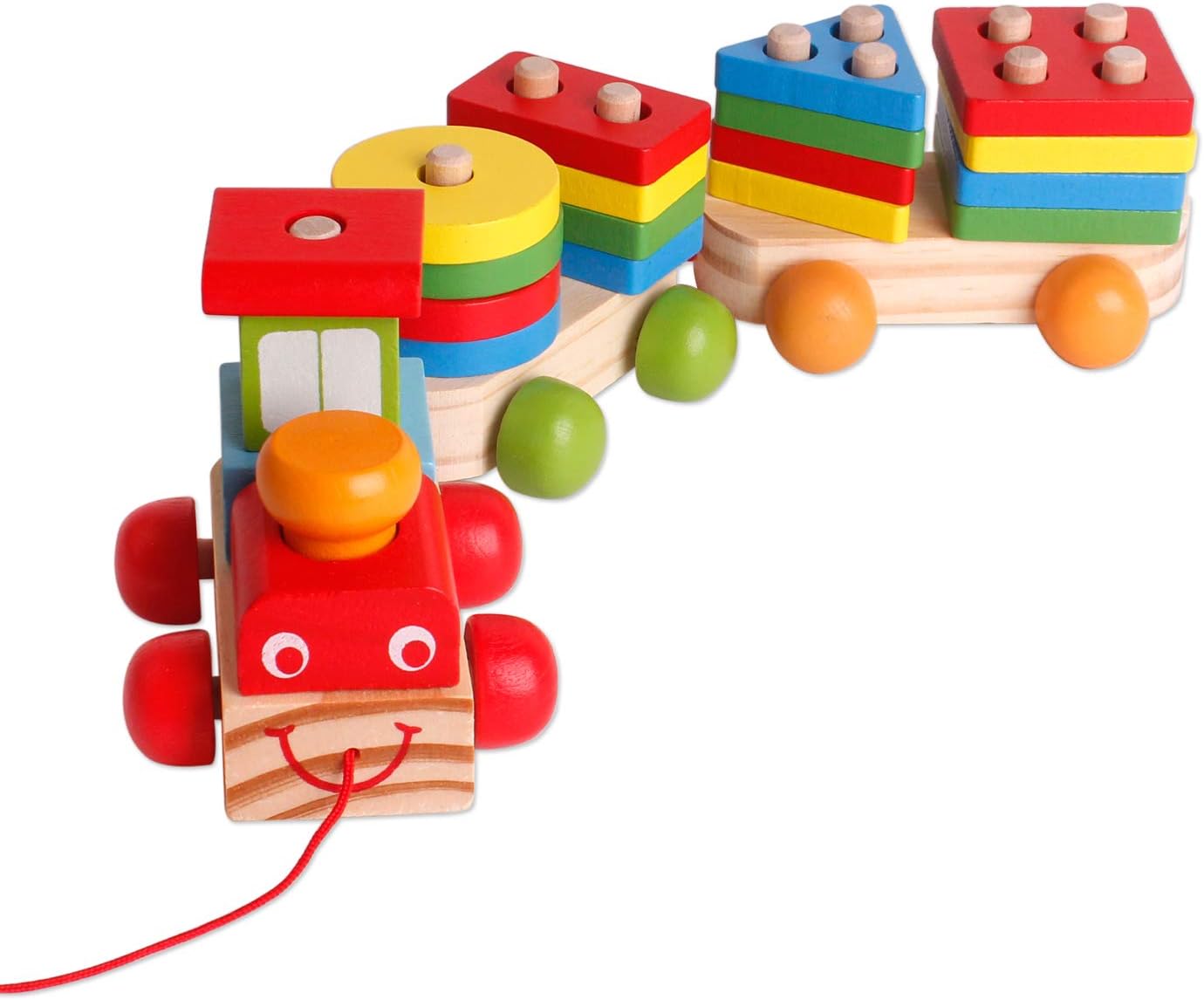 SHIERDU Children’s Wooden Building Block Train Toy Shape sorter and Stacking Game for Toddlers Montessori Benefit Intellectual pre-School Education Pull Toy