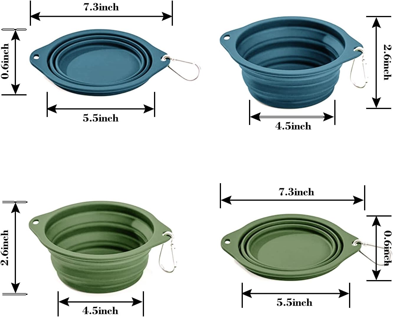 CAPACITY PET BOWLS: Expand bowl with size: 7.3″x7.3″x2.6″, Our pet travel bowls have three different collapsible levels, can holds up to 28 fluid ounce water and collapses to .60-inch thickness.